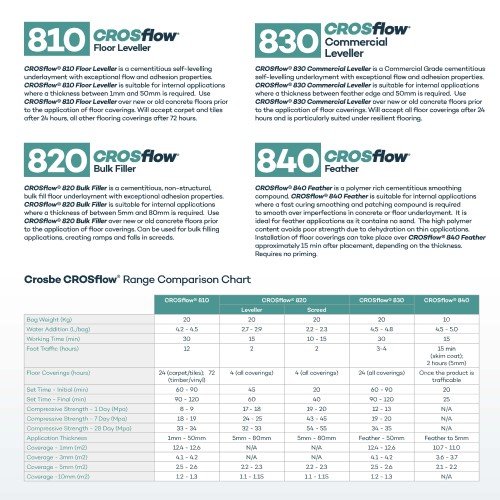 A 20-kilogram bag of CROSflow® 830 will cover approximately 4.1 m2 with a thickness of 3 mm and 2.5 m2 with a thickness of 5 mm.