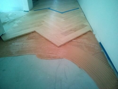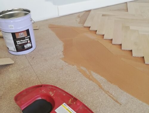 3. Place the wood in the adhesive within the working time. Position it and press down or tamp down with a rubber hammer to ensure good contact. Wood may move at first. To be sure to secure the initial row to limit movement and holding patterns.